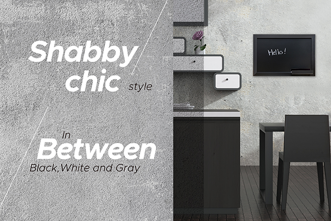 In between black, white and gray shabby chic style. Shabby chic is a style with a distressed or wear-and-tear feel, and natural textures.